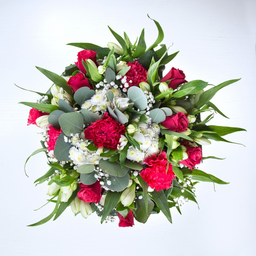 Delight in the luxurious charm of our red roses and white flowers arrangement. This bouquet features majestic red roses, sweet white chrysanthemums, and gypsophila, artfully combined with white alstroemeria and vibrant aspidistra leaves.