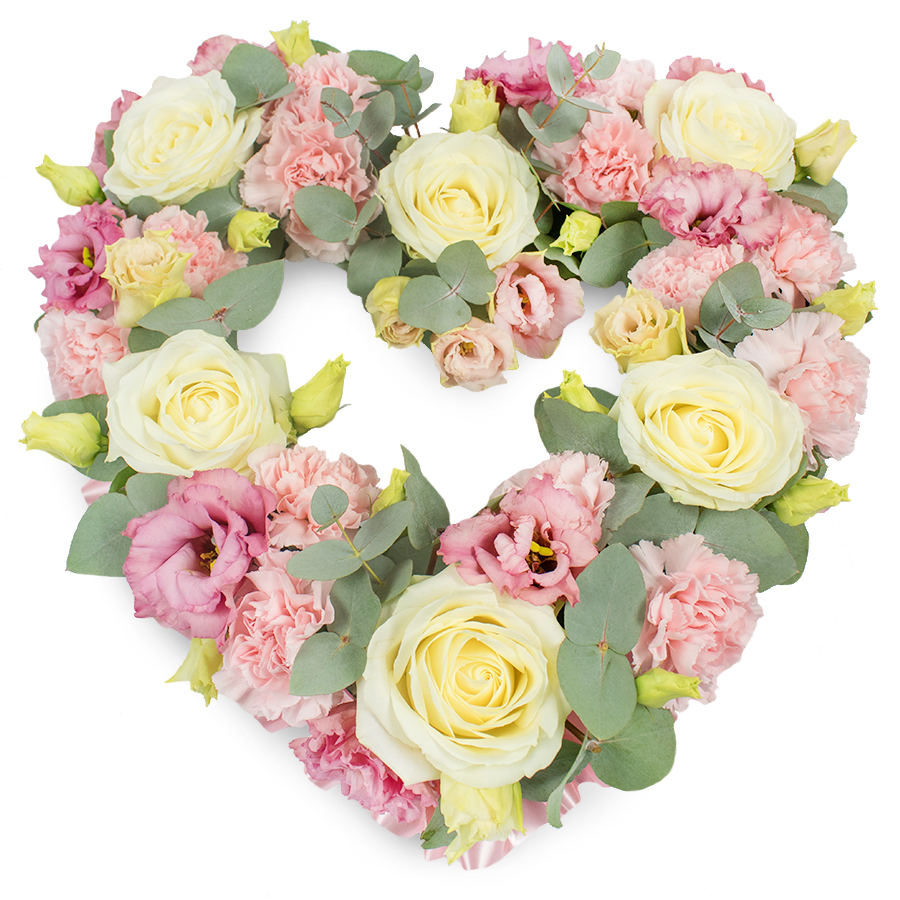 Convey your deepest emotions with our exquisite tribute arrangement, expertly designed to honor and remember loved ones. This beautiful bouquet features a stunning mix of white roses, pink carnations, pink lisianthus, and eucalyptus, ensuring a unique and heartfelt display.